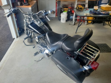 Harley Davidson en super condition toujours entretenue par le concessionnaire avec siège passageravec dossier porte bagages valise en cuir rigide avec serrure, pneu neuf, pare brise détachable, appuis pied et toile de protection .