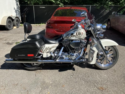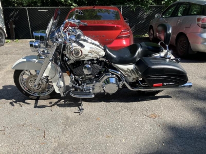 Road King 2005, 29 700km, carburateur, blanc perle, pneu arrière neuf, pneu avant très bon état, batterie, plug, filage, neuf, alarme, casque(XL), manteau doublé-aéré(L) porté 2 fois, casing élargi pour pneu plus gros, mécanique A1, rien a faire dessus.