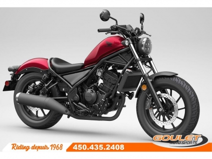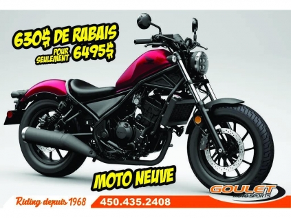 Honda CMX 300 REBEL ABS \*\*\* 630$ DE RABAIS - Prix Final de 6495$ - Moto neuve avec sa pleine garantie Honda \*\*\* La Rebel 300 est la moto cruiser type custom de Honda. Avec son réservoir au look classique, son cadre étroit, sa position très Low Ride, sa fourche d'allure inclinée et ses éléments noirs, la Rebel combine les styles « bobber » et « chopper » - Selle basse (27,2pc) facile à enfourcher avec siège passager - Moteur monocylindre refroidi par liquide et à injection - Lumière et clignotant au DEL - Les gros pneus (130/90-16 à l'avant, 150/80-16 à l'arrière) font contraste au cadre étroit de la Rebel et ajoutent à sa posture solide et confiante. - Des freins à disque avant et arrière produisent un freinage efficace et sûr. Le système ABS de série offre une performance de freinage exceptionnelle \*\*\* FRAIS DE TRANSPORT ET PRÉPARATION INCLUS DANS LE PRIX\*\*\* Cette unité est chez Goulet Moto Sports de Ste-Thérèse. Téléphonez au 450.435.2408 Possibilité de financement avec plusieurs institutions financières. 2ième chance au crédit disponible. Goulet Moto Sports est votre concessionnaire moto depuis 1968. Fier représentant officiel des marques HONDA, APRILIA, MOTO GUZZI, VESPA, PIAGGIO, KTM, NIU, SURRON et URAL pour le grand Montréal. Nous avons un énorme choix de moto usagés inspectées par nos professionnels. 2 adresses pour vous servir, soit à Sainte-Thérèse (450.435.2408) et Saint-Jérôme (450.431.6622). Goulet Moto Sports ne peut être tenu responsable d'une omission, d'un délai ou d'une erreur de transcription de l'information. Le prix affiché reflète la condition de l'unité. Pour différentes raisons les prix peuvent différer de ceux indiqués en ligne. Les données sont affichées à titre indicatif seulement et ne peuvent être considérées comme une information contractuelle. Nous vous encourageons vivement à nous consulter pour plus de détails avant de vous déplacer. Des frais tels que taxes, immatriculation, administrations ou autres peuvent s'appliquer. Essence, Transmission: Manuelle, 6 vitesses, Système de refroidissement: Refroidi au liquide, 1 cylindres, 286.0 CC, Garantie: 1 an ---------------------- Honda CMX 300 REBEL ABS \*\*\* $630 OFF - Final Price $6,495 - New motorcycle with full Honda warranty \*\*\* The Rebel 300 is Honda's custom cruiser motorcycle. With its classic-looking fuel tank, narrow frame, ultra-low-ride stance, raked fork, and black accents, the Rebel combines bobber and chopper styles. - Low seat (27.2 in) for easy entry and exit with passenger seat. - Liquid-cooled, fuel-injected single-cylinder engine. - LED lights and turn signals. - Large tires (130/90-16 front, 150/80-16 rear) contrast with the Rebel's narrow frame and add to its solid, confident stance. - Front and rear disc brakes provide efficient and secure stopping power. The standard ABS system provides exceptional braking performance. \*\*\* TRANSPORTATION AND PREPARATION INCLUDED IN THE PRICE \*\*\* This unit is at Goulet Moto Sports in Ste-Thérèse. Call 450.435.2408. Financing available with several financial institutions. Second chance credit available. Goulet Moto Sports has been your motorcycle dealer since 1968. Proud official representative of the HONDA, APRILIA, MOTO GUZZI, VESPA, PIAGGIO, KTM, NIU, SURRON, and URAL brands for the greater Montreal area. We have a huge selection of used motorcycles inspected by our professionals. We have two locations to serve you: Sainte-Thérèse (450.435.2408) and Saint-Jérôme (450.431.6622). Goulet Moto Sports cannot be held responsible for any omission, delay, or transcription error of the information. The price displayed reflects the condition of the unit. For various reasons, prices may differ from those indicated online. The data displayed is for informational purposes only and cannot be considered contractual information. We strongly encourage you to contact us for more details before traveling. Fees such as taxes, registration, administration, or others may apply. Gasoline, Transmission: Manual, 6 speeds, Cooling System: Liquid cooling, 1 cylinders, 286.0 CC, Warranty: 1 an